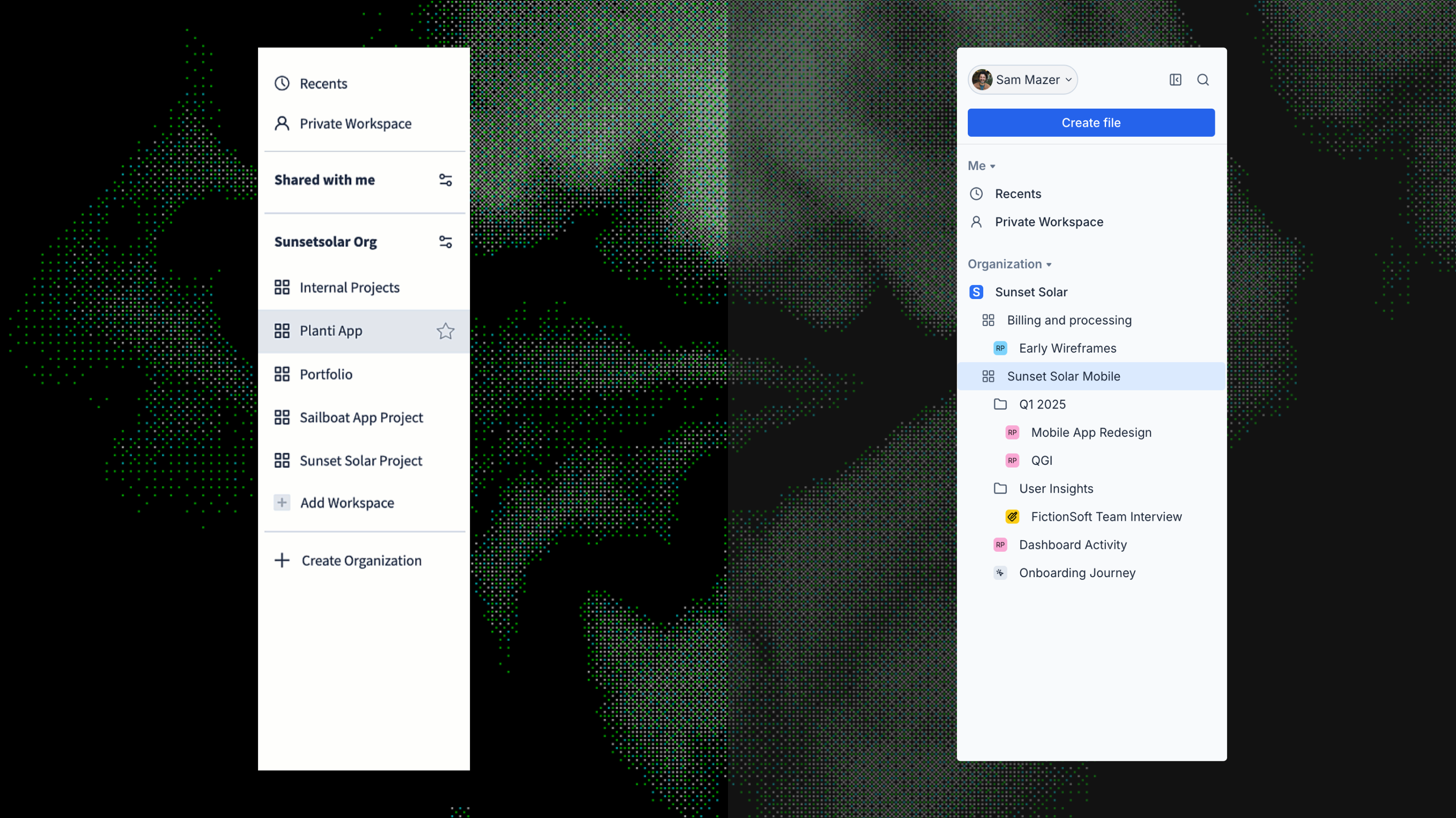 The sidebar had no fast path to create a new file, users could not see the contents of a workspace without navigating away, and there was no way to get the sidebar out of the way when working in a full-screen Whiteboard.